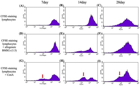 Assay of immune rejection in vitro by mixed lymphocyte reaction assays (MLR). CFSE-staining lymphocytes as a negative control at (A) day 7, (B) day 14, and (C) day 28. CFSE-staining lymphocytes were incubated with allogeneic BMSCs in a ratio of 1:3 at (D) day 7, (E) day 14, and (F) day 28. CFSE-staining lymphocytes stimulated with ConA as a positive control at (G) day 7, (H) day 14, and (I) day 28. A left-shift peak (red arrow) indicates lymphocyte proliferation, suggesting an immune response to external stimuli.