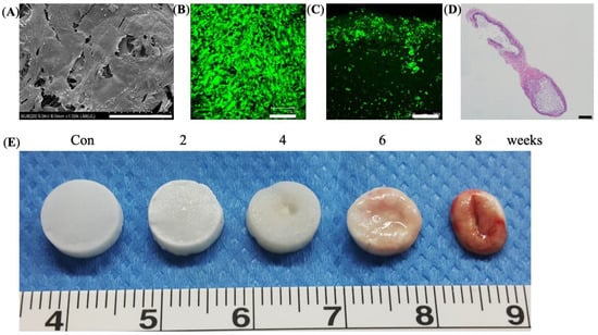 SEM revealed that seeded cells were distributed on the scaffold and produced extra-cellular matrix (Figure 3A). Next, the live/dead cell assay verified that live cells were dispersed on the surface and infiltrated 0.75 to 1.00 mm in depth (Figure 3B,C). The histology revealed bone regeneration of implanted BMSC-seeded cryogel scaffolds subcutaneously at week 8 (Figure 3D). Finally, by the in vivo degradation assay, the cryogel scaffold (unseeded) gradually degraded throughout the 8-week observation period (Figure 3E).