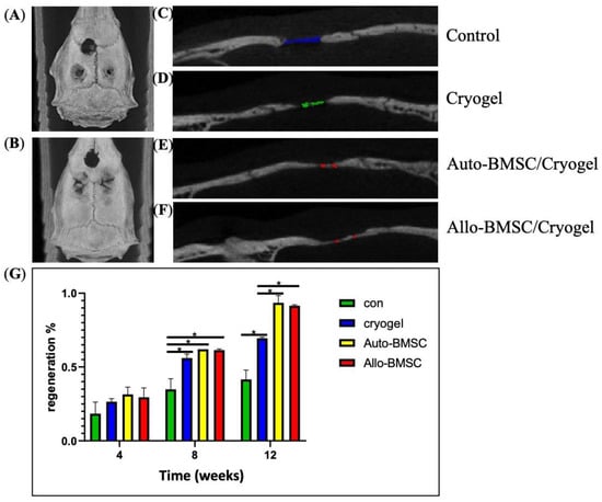 Bone regeneration in rat calvarial-defect model at week 12 by micro-CT. Upper defect: control; lower left: cryogel; lower right: cryogel and BMSC. (A) Axial view of autologous BMSC at lower right defect. (B) Axial view of allogeneic BMSC at lower right defect. (C) to (F) Sagittal view of skull defects. Defects marked with colors. (C) Control. (D) Cryogel. (E) Cryogel and autologous BMSC. (F) Cryogel and allogeneic BMSC. (G) Percentage of bone regeneration in bar graph (mean and SD) measured via micro-CT. * p < 0.05.