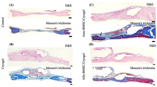 Histology of bone regenerative potentials at week 12. H&E stain and Masson’s Trichrome stain of (A) control (B) cryogel (C) autologous BMSC/cryogel (D) allogeneic BMSC/Cryogel, Scale bar = 500 μm.
