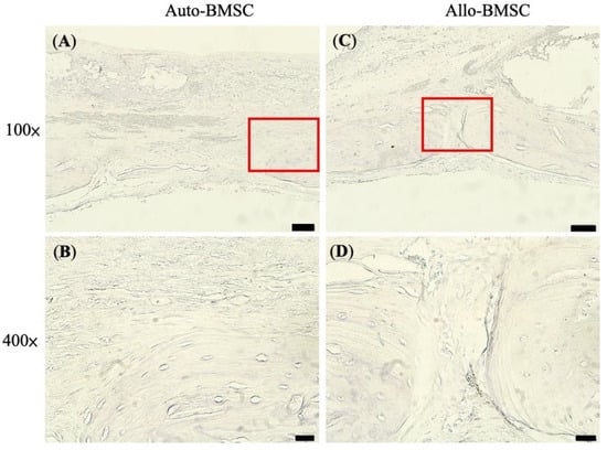 Immunohistochemistry of CD4+ T cells at week 12. Absence of CD4+ T cells in autologous BMSC-seeded cryogel (A) 100× (B) 400× and in allogeneic BMSC-seeded cryogel (C) 100× (D) 400×. Scale bar = 200 μm.