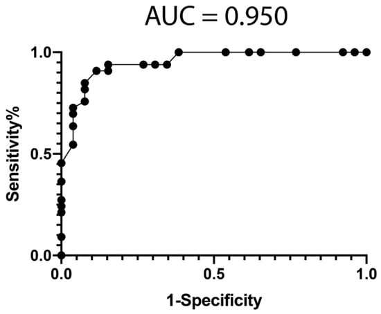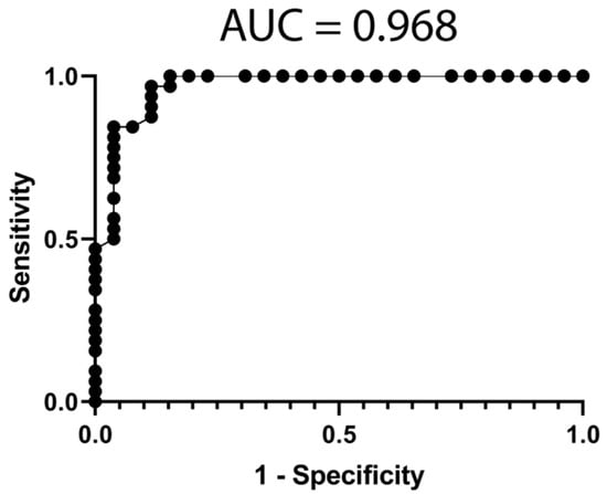 Classification model performance from informative miRNA data. A ROC was constructed with expression data from 18 miRNAs (hsa-miR-1284, hsa-miR-185-5p, hsa-miR-20a-5p, hsa-miR-210-5p, hsa-miR-3127-5p, hsa-miR-3149, hsa-miR-34c-5p, hsa-miR-511-5p, hsa-miR-548ah-3p, hsa-miR-551b-5p, hsa-miR-579-3p, hsa-miR-615-5p, hsa-miR-6786-3p, hsa-miR-6798-3p, hsa-miR-6813-5p, hsa-miR-6850-3p, hsa-miR-6875-5p and hsa-miR-6889-5p) from the 59 patients. The classification model was built using a SMO-based classifier, included in the WEKA suite. AUC = Area under the curve.