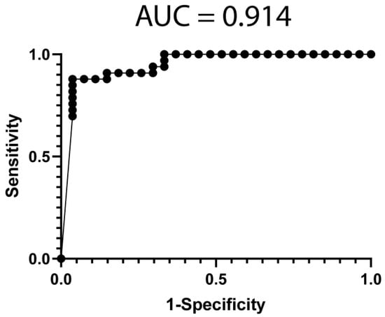 Interestingly, although RPE atrophy was higher in the group with a poorer response, as it is seen regularly in the clinic [,,], it did not show discriminatory power between groups (AUC = 0.64, p = 0.0544) in the present study.