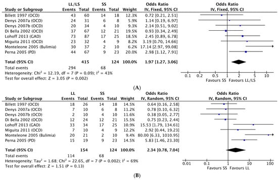 A total of seven studies comprising 535 (range: 39–112) participants investigated the genetic association between the 5-HTTLPR polymorphism and antidepressant response in non-MDD patients (Table 2). Six of the studies primarily included individuals of European ancestry [30,31,32,33,34,35], and one study did not specify the ancestry of the studied population [36]. Clinical diagnoses across studies included OCD (4 studies) [30,31,32,36], GAD (1 study) [33], panic disorder (1 study) [35], and bulimia (1 study) [34]. Most studies used prospective study designs (6 studies) and included at least one SSRI (6 studies). Only one study [33] reported genotyping results for the SLC6A4 rs25531 polymorphism. Symptom severity scales and thresholds employed varied by study (see Table 2 for details). Three studies [30,32,36] used the Yale–Brown obsessive compulsive scale, while the other studies used the panic disorder severity scale [35], Hamilton anxiety rating scale [33], bulimia investigation test [34], or a single-item three-point severity scale [31].