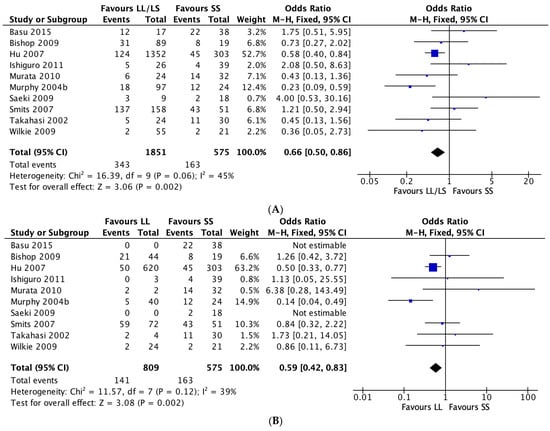 Forest plots of 5-HTTLPR polymorphisms and adverse drug reactions in studies with participants taking SSRIs by genotype comparisons. (A) LL/LS vs. SS; (B) LL vs. SS; (C) L vs. S.