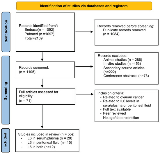 The PRISMA flow chart (Figure 1) shows the number of studies searched from PubMed and Embase. A total of 2189 articles were identified. The duplicates of 1084 articles were removed from the selection, and 1105 records were thus selected for screening. After reading the title and the abstract, we removed 286 animal studies, 222 secondary articles, 453 in vitro studies, and 73 conference articles. After removing these articles, 71 studies were included for complete analysis. Then, following our inclusion criteria, the final 55 articles involving IL6 assessed in serum and ascitic fluid of ovarian cancer patients were added for the meta-analysis. With further detailed evaluation, we were able to retrieve 28 studies for IL6 levels only in serum, 15 only in ascites fluid, and 12 both in serum and ascites fluid. All studies are listed in Table 1.