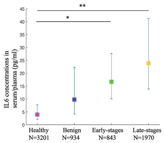 As there is currently no effective screening procedure for OC, in addition to its vague symptoms, more research needs to be done to tackle the difficulties in diagnosing this disease. Thus, knowledge in the etiology and mechanism of OC may shed light on both better diagnosis and treatment for this disease. It has been frequently proposed that inflammation, orchestrated by cytokines, may be the driver that induces OC [22]. Within the tumor microenvironment, the OC cells and other stromal cells secrete proinflammatory cytokines, such as IL6 and others. Several studies have further shown that increased inflammation levels in the tumor microenvironment promote poorer prognosis for OC (reviewed in [22,29]). Here, we analyzed published articles in Medline and Embase databases that measured IL6 in the circulation and the peritoneal fluid of women with OC in order to provide fundamental baselines on the absolute concentration levels of IL6 in various stages of this disease, as well as to determine the potential of IL6 as a biomarker for not only the late-stage, but also for the detection of the early-stage OC, which is currently difficult to diagnose. By calculating the pooled weighted mean values followed by post hoc tests, we found that IL6 levels in the circulation were increased in both early- and late-stage OC in comparison to healthy and benign controls. However, the increased plasma/serum IL6 levels were only significant when OC samples were compared to the healthy control samples. This shows that IL6 has the potential to be a diagnostic biomarker to detect OC formation, but it may not be specific enough to distinguish it from benign growth. In contrast, we show a significant increase of IL6 concentrations in the ascites of OC patients, both at the early and late stages, in comparison to benign controls. Thus, this highlights the utility of ascitic IL6 to detect OC importantly at the early stages.