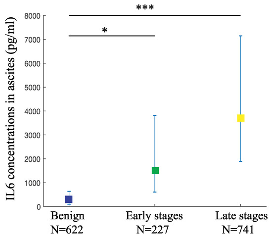 - Kampan, N.C.; Madondo, M.T.; Reynolds, J.; Hallo, J.; McNally, O.M.; Jobling, T.W.; Stephens, A.N.; Quinn, M.A.; Plebanski, M. Pre-operative sera interleukin-6 in the diagnosis of high-grade serous ovarian cancer. Sci. Rep. 2020, 10, 2213. [Google Scholar] [CrossRef] [PubMed]