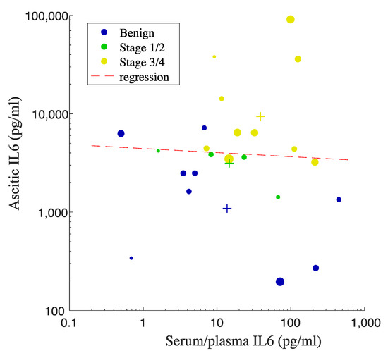Linear regression analysis for the correlation between IL6 in serum/plasma vs. ascites. Each dot represents the mean value, and the size of the dot correlates with the number of participants from each study. Each plus sign indicates the pooled mean value of IL6 from each OC or benign group. IL6 concentrations are in pg/mL The color of the plus signs matches that of the data points.