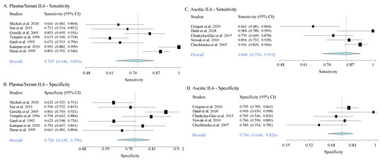 Using a random effect forest plot, we further determined the overall sensitivity and specificity of IL6 in detecting OC from the benign controls. This part of the analysis was conducted in combined stages of OC. The overall sensitivity and specificity levels of both plasma/serum and ascitic IL6 were favorable to discriminate all-stage OC cases from benign controls. This indicates a strong potential for IL6 to be used as a biomarker for OC. However, with this result, the accuracy of IL6 to detect OC specifically at the early stages is still unknown. Two articles showed high sensitivity and specificity provided by serum/plasma IL6 when combined with other markers to detect early-stage OC; however, more studies are needed to confirm these findings [45,77].