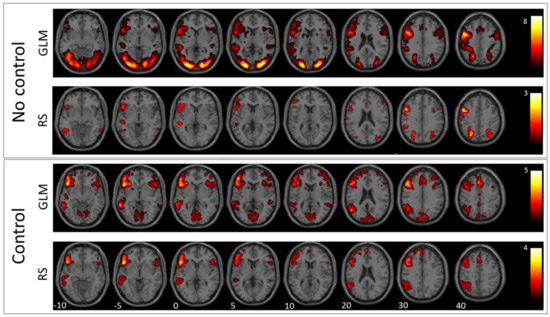 Second, our study population was investigated with regard to language laterality by means of the WMLI. The use of GLM contrasts applying a linguistic control condition for selecting language-related ICs resulted in a significantly more unambiguous and higher language laterality index than without the application of a linguistic control condition. In contrast, the comparison of language laterality indices between the two GLM contrast conditions per se did not yield any significant results. The more focused and more specific activity distribution in GLM contrast with the control condition significantly increased laterality pronunciation in the RS-fMRI result, which is also reflected in the higher and more focused WMLI with the control condition than the more dispersed distribution without the control condition (compare box plots of Figure 4, bottom row). In detail, the WMLI results on the single-subject level are consistent. The GLM results for both verb and antonym generation tasks result in comparable—and, in particular, same signed—WMLIs for most patients. Dodoo-Schittko et al. assumed in 2012 that, in the case of TB-fMRI, the application of a linguistic control condition such as syllable switching may predict language laterality more unambiguously by means of higher LIs in healthy controls. This assumption could not be supported by the data of this study on the level of the GLM alone. Only the combination of RS-fMRI and TB-fMRI yielded significantly higher and more unambiguous language laterality indices due to the application of a linguistic control task. One reason why the GLM alone did not benefit from linguistic control conditions may also be the considerable heterogeneity of the patient group according to differences in brain tumor location, volume, or dignity.