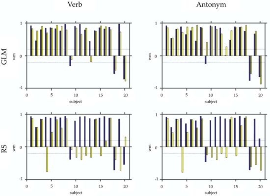 This figure depicts the WMLI on a single subject basis. In the upper row, panels show the results of the SPM contrasts (GLM) for the verb and antonym generation. In the bottom row, the same is shown for the selected RS-fMRI components (RS). Each panel shows bar plots with the WMLI results using a control condition (blue) vs. not using one (yellow). For better interpretation of the WLMI results, we added two dashed lines representing the interval [−0.2; 0.2].
