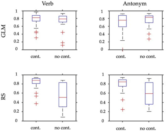 This figure depicts box plots of the WMLI of the laterality index calculations (absolute values). In the upper row, panels show results for the SPM contrasts (GLM) for the verb and antonym generation. The bottom row shows the same for the selected RS-fMRI components (RS). Each panel depicts box plots resulting from employing the task either with the control condition (cont.) or without (no cont.).