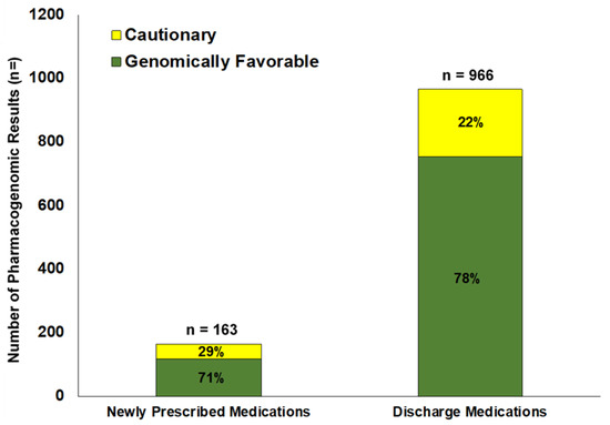 | Newly Prescribed Medications (Name) | Gene(s) | Pharmacogenomic Relevance | Total Unique Pharmacogenomic Results (n = ) | Genomically Favorable [n (%)] | Cautionary [n (%)] |