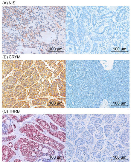 Immunohistochemical staining of NIS, CRYM, and THRB. Positive (left) and negative (right) immunohistochemical staining of NIS (A), CRYM (B), and THRB (C).