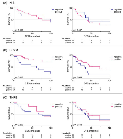 Kaplan–Meier survival curves. CSS and DFS for positive and negative protein levels of NIS (A), CRYM (B), and THRB (C). CSS: cause-specific survival; DFS: disease-free survival; p: log-rank p-value.
