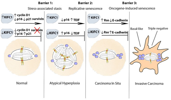 Proposed model of KIFC1-mediated breast neoplastic progression. KIFC1 may assist pre-neoplastic and pre-invasive cells to progress by facilitating their bypassing of tumor-suppressive barriers to malignant transformation and immortalization. To bypass the first barrier (stress-associated stasis), KIFC1 may upregulate cyclin D1 and/or survivin levels or be upregulated as a result of p16 and p21 loss to facilitate survival of centrosome-amplified cells. To bypass the second barrier (replicative senescence), in addition to being upregulated as a result of p16 loss, KIFC1 may be upregulated as a result of telomere dysfunction-mediated induction of TEIF to allow centrosome-amplified cells to persist. Alternatively, KIFC1 could promote selective survival of cells that can reactivate telomerase. To bypass the last barrier (oncogene-induced senescence), KIFC1 may induce the survival of cells with Ras signaling-induced CA. In addition, KIFC1 may promote the loss of E-cadherin as a result of causing cytoarchitectural reorganization, which may impart invasive capabilities to pre-invasive cells. Abbreviations: KIFC1, Kinesin family member C1; TEIF, telomerase transcriptional elements-interacting factor.