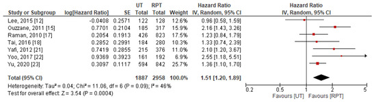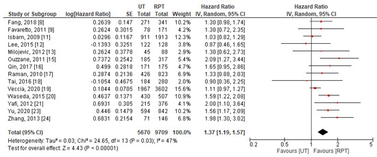 | First Author, Year [Reference] | Journal | Country | Study Design | Recruitment Period, Years | No. of Patients, n RPT/UT | Follow Up, Months RPT/UT | Reported Outcomes | Methodological Quality (NOS) |