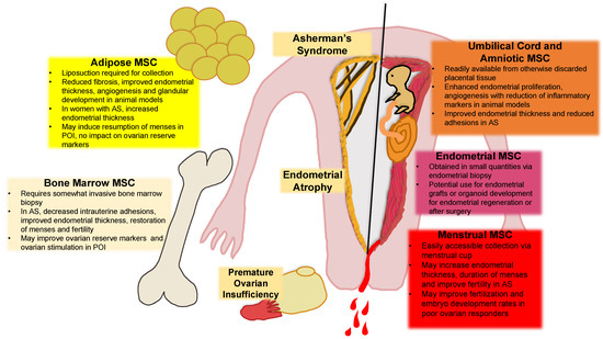 Sources of mesenchymal stem cells and implications for treatment of endometrial and ovarian-related infertility. This figure describes the various potential sources of mesenchymal stem cells including their collection and described therapeutic effects. The solid black line delineates physiologic endometrium (right) from pathologic endometrial environment (left). AS = Asherman’s Syndrome; MSC = Mesenchymal Stem Cell; POI = Premature Ovarian Insufficiency.