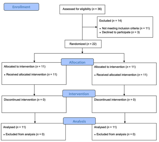Out of 36 breast cancer patients assessed for eligibility, 14 were excluded (11 did not meet inclusion criteria, 3 declined to participate). Thus, a total of 22 study participants were enrolled and randomly allocated into 2 groups: Group A (n = 11; mean age: 51.73 ± 10.73 years; body mass index (BMI): 25.56 ± 5.17 kg/m2) and Group B (n = 11; mean age: 58.55 ± 9.71 years; BMI: 27.31 ± 3.84 kg/m2).