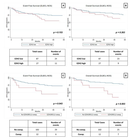 Univariate analysis of Event Free Survival (EFS) and Overall Survival (OS) in DLBCL-NOS. The displayed Kaplan Meier curves show comparison of EFS and OS with regard to: (A) and (B)-EZH2 expression levels; (C) and (D)-EZH2/BCL2 co-expression (coexp).