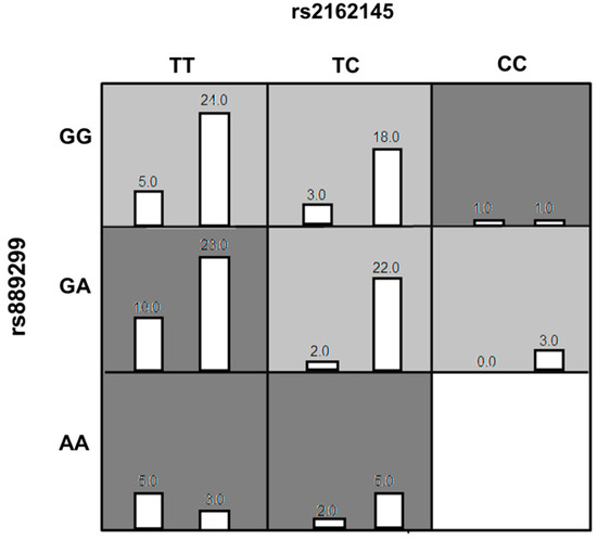 The best Multi-factor dimensionality reduction (MDR) model of interaction among rs2162145 and rs889299. The distributions of Controlled (left bars) and Uncontrolled (right bars) are illustrated for each combination of genotypes. Each cell represents genotype combinations. Dark grey cells represent genotype combinations implicated in uncontrolled type 2 diabetes mellitus (T2DM) in response to metformin/SU treatment. light grey cell represent genotype combinations implicated in controlled T2DM in response to metformin/SU combination therapy. White cells represent missing data. MDR= Multi-factor dimensionality reduction.