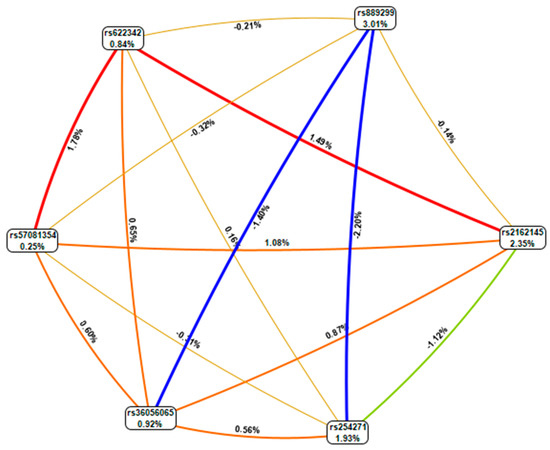MDR combined attribute network showing all possible interactions between single nucleotide polymorphisms (SNPs). Each colour represents a possible interaction. Figures and line width indicate the strength of the interaction. Figures < 1 and thin lines represent weak interactions. The strongest interactions are represented by figures ≥1 and thick lines. The image was generate using open-source MDR software package version 3.0.2.