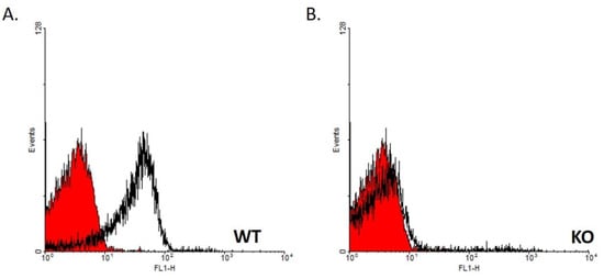 Heparinized peripheral blood samples (100 µL) were collected from the orbital sinus of WT (Figure 1A) and KO (Figure 1B) mice and diluted in PBS. The samples were then centrifuged at 2000 rpm for 5 min. The pellet was incubated with 100 µL of rat anti-CD24 antibody, clone M1/69, at 4 °C for 30 min. Cells were washed twice in FACS buffer (10% FCS, 0.01% sodium azide in ice-cold PBS). Then, 100 µL of 1:100 diluted fluorescein isothiocyanate (FITC)-conjugated goat anti-rat antibody (Jackson Immunoresearch Laboratories, Inc 872 West Baltimore Pike, West Grove, PA, USA 19390., 112-095-003) was added to the pellet and incubated at 4 °C for 30 min. Cells were washed twice with FACS buffer, and bound antibodies were detected on a FACSCalibur™ and analyzed using CellQuestio.