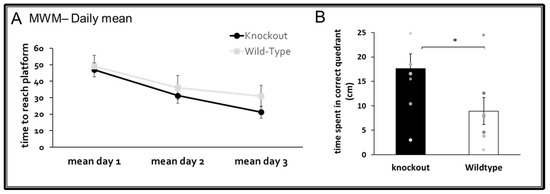 In adulthood, WT and CD24−/− mice were also assessed for long-term spatial memory in the Morris water maze test. At the age of 6 months, CD24 knockout mice exhibited improved spatial long-term memory in the probe-phase of the test compared with age-matched WT mice (U = 13, p = 0.049; Figure 5B). There was also a trend toward better learning skills of CD24 knockout mice on the 3rd day of the test. (Figure 5A). There was no difference in velocity between the WT and KO mice during any of the test phases indicating that motor functions did not influence the cognitive results (for more details see Supplementary file, Figure S1).