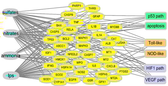 In response to exposure to the PM-derived mixture, a network of target genes was revealed. As oxidative radical stress is considered to be the etiology of PM-induced tissue injury, many key network genes are involved in the cell death pathway, including p53. Moreover, another key feature of the network was the association of exposure to inflammatory stress signaling (toll-like receptor and NOD-like receptors) and hypoxia (HIF1 and VEGF pathway). All the molecular associations with cell death, inflammation, and hypoxia signaling pathways indicate the pathological outcomes in the exposed mucosal barrier during PM exposure. Furthermore, the disruption of gut permeability and epithelial injuries is subsequently associated with increased microbial access to the underlying mucosal immune tissues and cells, leading to inflammatory responses and changes in the mucosal microbial community.
