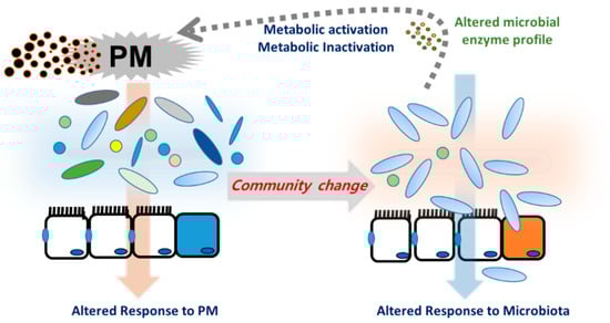 Particulate matter (PM)-induced alternation of mucosal microbial community. Host- and microbiota-derived xenobiotic metabolic enzymes are involved in metabolism of PM constituents. Moreover, PM can directly alter the microbial community, which inversely determines the fate of PM-derived xenobiotics or affect host responses during PM exposure.