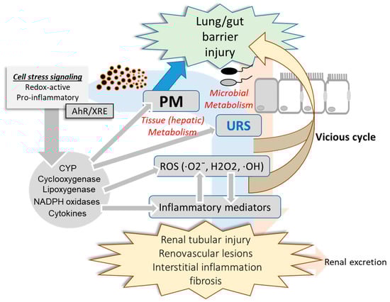 Circulatory PM and uremic metabolites are detrimental to the renal parenchymal and endothelial tissues in a similar way as the predicted network disruption in the mucosa (Figure 1). In particular, PM can generate ROS including hydroxyl radical (OH) mainly from transition metals and quinones in the airway mucosa [61]. In terms of molecular mechanism of toxicity,∙OH is one of strong genotoxic molecules that quickly bind to and injure DNA [62]. Furthermore, PM-derived redox-active compounds and oxidation products of the lipid membrane can serve as ligands for AhR via transcriptional activation of the xenobiotic responsive element (XRE), leading to expression of genes involved in diverse pathologic events in exposed cells [63]. As previously mentioned, URS and other active microbial metabolites also can contribute to the total pools of AhR ligands during PM exposure. In particular, AhR-XRE signaling mediates expression of ROS-producing metabolic enzymes including cyclooxygenase, lipoxygenase, CYP and NADPH oxidase [64,65,66,67,68,69]. In addition to effects on ROS production and xenobiotic metabolism, AhR-linked signaling is involved in proinflammatory cytokine production and cell death responses [70,71]. URS-induced oxidative stress and proinflammatory cytokines cause necrotic and apoptotic death of the renal tubular and renovascular cells [72,73]. Mechanistically, PM- or URS-activated AhR can disrupt the mitochondrial membrane potential or trigger other diverse cell death signaling pathways, which is the crucial step of renal tubular and renovascular tissue injuries during PM exposure [72,73,74,75]. In contrast, PM, URS, and their active metabolites attenuate the antioxidant capacity in response to the oxidative stress in the mucosa-renal axis. For example, phenyl sulfate, IS and PCS decrease glutathione level in the renal tubular cells [76]. Furthermore, URS-induced chronic distress facilitates progressive interstitial inflammation and renal fibrosis via tissue fibrotic factors including TGF-β1 and α-smooth muscle actin, which ultimately hasten CKD progression [77,78]. Taken together, PM and mucosa-derived metabolites cause renal tubular and endothelial injuries via the oxidative and proinflammatory stress signaling. Moreover, chronic inflammatory and fibrogenic processes aggravate the renal distress during PM exposure.