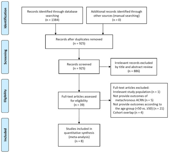 Among the eight studies, four were conducted in the USA [16,18,21,22], three were performed in Korea [17,19,20], and one was conducted in Israel [23]. All studies excluded patients with high-risk factors such as hereditary CRC syndrome, inflammatory bowel disease, or a history of CRC. Although the definition of metachronous ACRN slightly differed across the studies, the following definition was commonly used in most studies: “high-grade dysplasia, villous adenoma, adenoma ≥10 mm, or cancer”. In all studies except one, the ≥50 years group had no upper age limit. However, in the study by Kim, H.G., et al. [19], the ≥50 years group consisted of patients aged 50–54 years.
