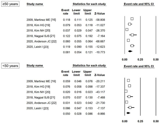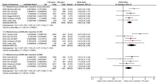 Forest plots after excluding the study by Kim, H.G., et al. [19], in which the ≥50 years group consisted of patients aged 50–54 years, are shown in Figure S1. Overall, the results of sensitivity analyses were similar to the main outcomes. Patients aged ≥50 years had a higher risk of metachronous ACRN than those aged <50 years without significant heterogeneity (OR (95% CI): 1.71 (1.43–2.05); df = 4, p = 0.59, I2 = 0%). The impact of age on the metachronous ACRN was also identified in both patients with LRA and HRA.