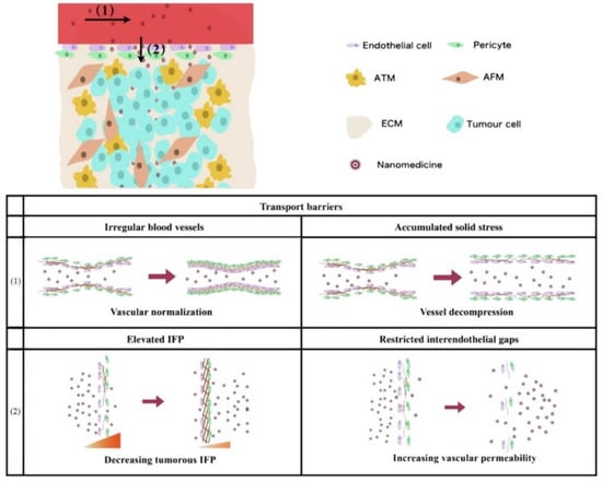 Figure 2. Schematic representation of vascular-related problems and countermeasures faced in the process of nanodrug penetration. (1) Intravascular transport: vascular irregularity and cumulative solid stress are resolved by normalization and decompression, respectively. (2) Trans-vascular transport: elevated interstitial fluid pressure (IFP) and limited endothelial space are improved by decreasing intertumoral IFP and increasing vascular permeability, respectively. Adapted from Yang et al. [115].