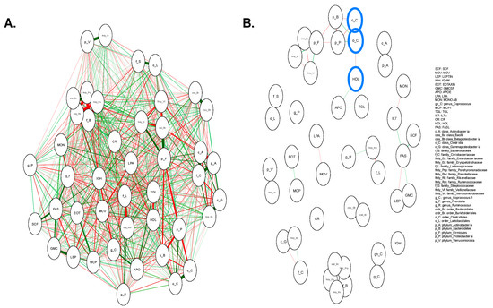3.5. Pairwise Correlation Network between the Microbiome and Extracted Features