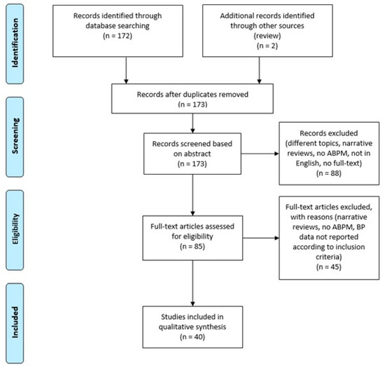 The search on PubMed database identified 172 results, with one duplicate removed. Two additional studies were identified in a review study and were subsequently included. After screening by title and abstract, 88 studies were excluded. Those accepted were consequently read full-text and 40 studies fulfilled the inclusion criteria, as illustrated in the flow chart (Figure 1). All the studies included were cross-sectional, most of them being prospective.