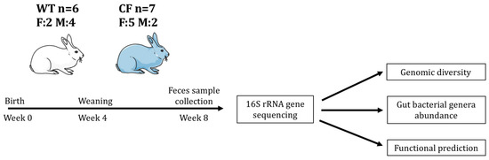 Of note, almost all CF rabbits suffer from the intestinal obstruction. In this study, we investigate the composition of feces bacteria as a proxy of gut microbiome of young CF rabbits (Figure 1). We hypothesize that the composition of bacterial communities in the CF rabbit intestine is different from that in the wild-type (WT) rabbits. In support of this hypothesis, the results revealed a marked taxonomic and inferred functional dysbiosis in the CF samples when compared to WT samples. This CF rabbit model of gut dysbiosis may facilitate the research and development of novel treatments for CF GI diseases.