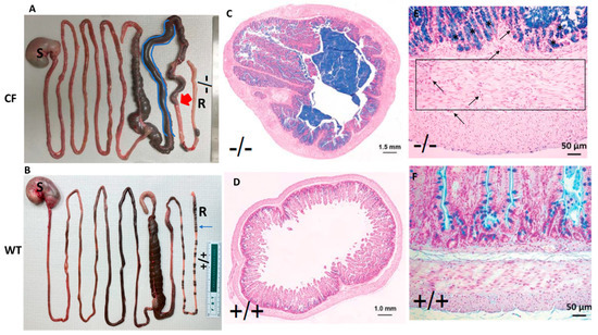 Intestinal obstruction is a common phenotype in CF rabbits. (A) Gross images of the GI tracks of a CF rabbit. The proximal colon (highlighted in blue) was dilated. Red arrow indicates the point of blockage. (B) Gross images of the GI tracks of a WT rabbit. Blue arrow indicates feces pellets, which are missing in the CF rabbit. (C) AB-PAS staining of the cross section of a CF rabbit colon. (D) AB-PAS staining of the cross section of a WT rabbit colon. (E) AB-PAS staining of the longitudinal sections of a CF rabbit colon. Region within the box is a representative area of interstitial fibrosis. Arrows indicate inflammatory infiltration; asterisks indicate goblet cell hyperplasia. (F) AB-PAS staining of the longitudinal sections of a WT rabbit colon. S: stomach. R: rectum. -/-: CFTR-/-. +/+: CFTR+/+.