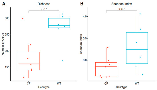Sample alpha diversity in CF and WT groups. (A) Richness measured by the observed number of OTUs. (B) Evenness measured by the Shannon index. The distributions of values were summarized by boxplots. Shown from bottom to top is the minimum value, first quartile, median, third quartile, and maximum value, and the outlier value is shown as individual points. On top of the boxplots, the individual data points were super imposed; p-values were calculated by a one-sided Wilcoxon rank sum test.