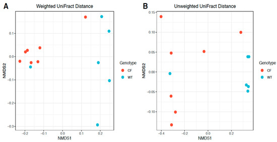 Beta diversity comparison between CF and WT groups based on OTU abundance. Beta diversity was calculated by phylogeny-based (A) weighted and (B) unweighted UniFrac distances based on relative abundances of identified OTUs, and visualized by non-metric multidimensional scaling (NMDS).