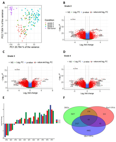 (A). Differential gene expression analysis results. Principal component analysis (PCA) plot of the normalized expression matrix. Each point represents individual samples. (B–D). Corresponding differentially expressed genes (DEGs) were obtained from comparisons of non-tumor vs. individual glioma grades by using the limma package with a 0.6 absolute log2 fold change and adjusted p-value < 0.01 with FDR cutoff, which is indicated with red points. (E). Relative fold change of significantly changed ETS members for glioma grade compared with non-tumor samples by differential gene expression analysis. (F). Intersection of DEGs between limma results, Elk1VP16 and PEA3VP16, which are our previously published micro arrays, were represented as venn diagrams.