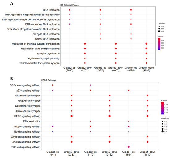 GO and KEGG enrichment analysis of differentially expressed genes for glioma grades. Each glioma grade was clustered as up- and downregulated gene clusters. (A). GO and (B). KEGG analysis were performed by clusterProfiler with an adjusted p-value < 0.05. The gene ratio indicates the number of genes enriched with a corresponding GO or KEGG term among the total gene number introduced into the enrichme.nt analysis.