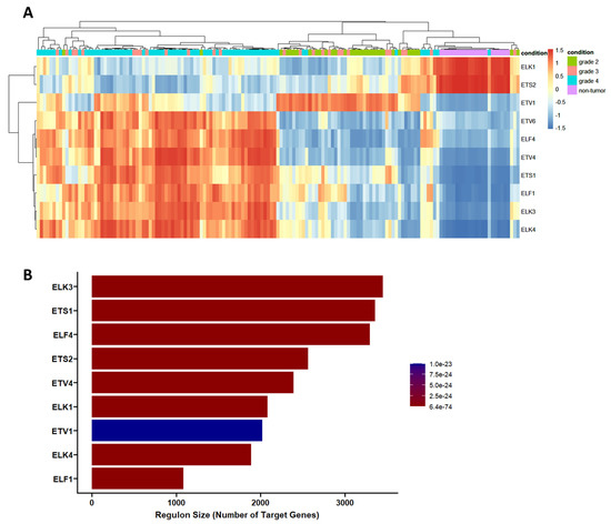 Regulon activity and size of the ETS-mediated gene regulatory network. (A). The correlation distance heatmap of regulon activity for non-tumor and glioma grades. (B). Regulon size of the individual transcription factor in the gene regulatory network resulting from the transcriptional network analysis (TNA).