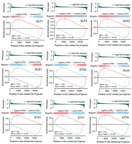 To determine the direction of regulation between each regulon and its targets, two-tailed GSEA was performed, and positively and negatively regulated co-expression patterns in target gene distribution were constructed for individual ETS regulons (Figure 5). In this analysis, genes were ranked for their fold changes in the x-axis, and enrichment scores were given in the y-axis; the peak of each plot is the enrichment score for the gene indicated (dotted lines), while the colored bar shows the positively and negatively correlated genes. These results suggest that enriched ETS regulons have both unique and common gene targets in gliomas, as indicated by a clear separation of negatively and positively correlated targets in regulons such as ETS2 and ELK1 (unique), and overlapping negative and positive regulons, such as those of ELF4 and ELK3 (common).