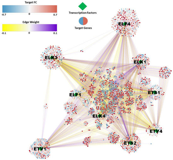 The network from the TNA algorithm was filtered by DEGs from Elk-1-VP16 and PEA3-VP16 overexpression microarray results to create a much more unique regulatory network of ETS members. As a result of filtering, a final regulatory network was constructed with 3366 target genes and 6610 interactions with ETS regulons, and the gene regulatory network was visualized with Cytoscape (Figure 6). This network representation shows fold changes of DEGs, as well as their interaction with the ETS regulons, showing the common targets to be clustered in the middle (Figure 6).