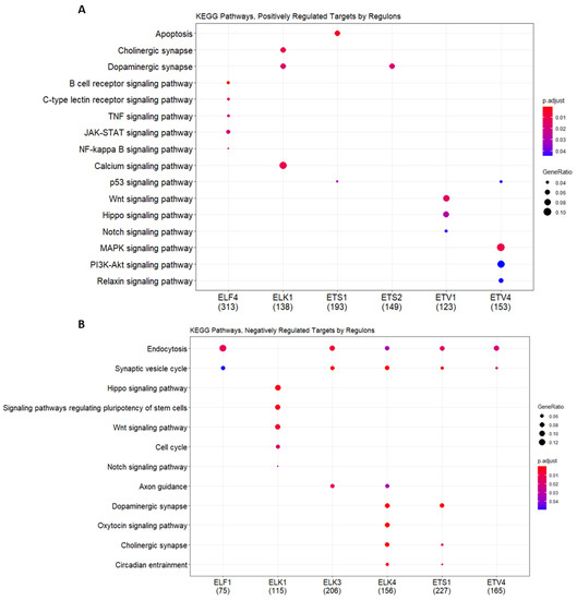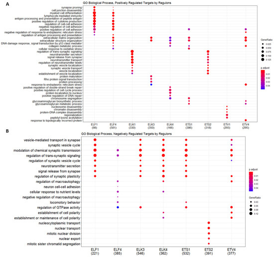Focusing on the functional investigation of the gene regulatory network, GO and KEGG enrichment analysis was performed with positively and negatively regulated targets of ETS regulons on the regulatory network (positive regulation indicates similar coexpression patterns, i.e., when ETS protein is downregulated, its targets are also downregulated, and vice versa). It was observed that positive and negative cluster targets of ETS regulons were enriched in biological processes, such as cell–cell adhesion, synapse formation, and protein localization, some of which are common across members, while some are unique for one or few family member(s) (Figure 7A,B, Supplementary Tables S4 and S5). ELF1 and ELF4 regulons appear to belong to similar biological processes; ELK1 and ETS2 also were found to have targets within the same biological pathways (Figure 7A). The ETV1 regulon appears to have a distinct set of positively regulated targets, while ELK3, ELK4, ETS1, and, to some extent, ETV4 appear to regulate similar biological processes (Figure 7A). This classification is not conserved for negatively regulated targets, however; here, ELF1, ELK3, ELK4, ETS1, and ETV4 appear to regulate similar biological processes, while the ELF4 regulon and ETS2 regulon each are comprised of distinct targets (Figure 7B). It is important to note that, in positively regulated targets of the ETV1 regulon, nucleosome and chromatin disassembly related processes were prominent, while no significant negatively regulated targets were identified for the ETV1 regulon. The ELK3 regulon included positively regulated targets in ECM organization, protein maturation, and processing pathways, and negatively regulated targets in synaptic vesicle signaling, synaptic transmission, and synaptic plasticity pathways.