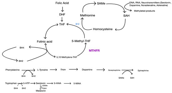 A growing body of literature suggests that one-carbon metabolism may moderate antidepressant treatment response [98]. The one-carbon cycle includes agents such as folate, L-methylfolate, S-adenosylmethionine (SAMe), vitamin B6, vitamin B12 and homocysteine. While the literature suggests that deficiencies in each of these components can be independently associated with depression, folate levels in particular are the most common [99]. Folate, otherwise known as vitamin B9, comes in 2 forms: as dihydrofolate (in foods) or in a synthetic form (supplements). The first step in this one-carbon metabolism is the conversion of synthetic or dietary folate to 5-methyltetrahydrofolate (L-methylfolate) via methylenetetrahydrofolate reductase (MTHFR) [100,101,102,103,104,105,106]. L-methylfolate (also known as levomefolic acid or 5-methyltetrahydrofolate) is the active form of folate or folic acid and plays a critical role in the synthesis of neurotransmitters. Methionine synthetase then uses the active form, L-methylfolate, as a methyl donor to convert homocysteine into L-methionine. Vitamin B12 helps carry out this reaction. Methionine then reacts with ATP to form SAMe. SAMe acts as a methyl donor, similarly to L-methylfolate, and plays a critical role in the methylation of monoamines and, therefore, the synthesis of neurotransmitters via the tetrahydrobiopterin (BH4) pathway and the hydroxylation of phenylalanine and tryptophan [100,101,102,103,104,105,106,107]. The folic acid pathway is illustrated in Figure 1 below.