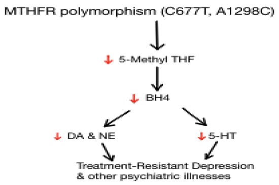 While investigating the role of folate deficiency in depression is important, it is also essential to consider the MTHFR gene; individuals may have genetic polymorphisms that affect the conversion of synthetic or dietary folate to L-methylfolate, the biochemically active form. If someone is homozygous for the T variant (TT), studies suggest that they have about 30% of the enzyme activity of people with the wild-type (CC) variant [100,101]. Heterozygous (CT) individuals have about 65% of the enzyme activity of CC individuals. In Caucasian North Americans, 8–20% of the population has the TT genotype. One meta-analysis of 10 studies found a small but significant increase in depression in people with the TT genotype [100,101]. Because MTHFR converts folate into L-methylfolate, the active form, if an individual has a genetic polymorphism that decreases or inhibits this conversion, it is reasonable to assume that this population may be more at risk for MDD and perhaps treatment-resistant MDD. Furthermore, this finding highlights the need for the administration of L-methylfolate, rather than folic acid, so that the defective enzyme can be bypassed.