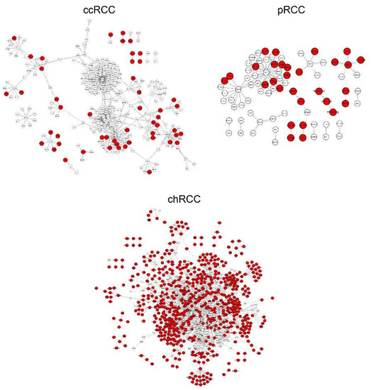 Differential interactome networks reconstructed with differential protein–protein interactions (dPPIs) around differentially interacting proteins (DIPs) in three Renal Cell Carcinoma RCC subtypes. Red nodes represent DIPs specific to the subtype of interest. ccRCC: Clear Cell Renal Carcinoma; pRCC: Papillary Renal Cell Carcinoma; chRCC: Chromophobe Renal Cell Carcinoma.